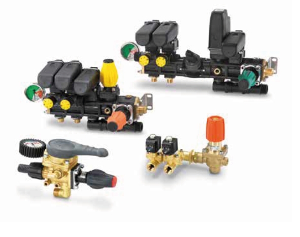 Grupos de comando modulares para atomizadores e máquinas de baixo volume, compostos por válvula de regulação, válvula de máxima pressão, válvula de descarga, válvulas de seção, filtro. Estes grupos de comando também estão disponíveis em latão, com válvulas de seção de solenóide. Disponíveis também na versão com rádio comando.